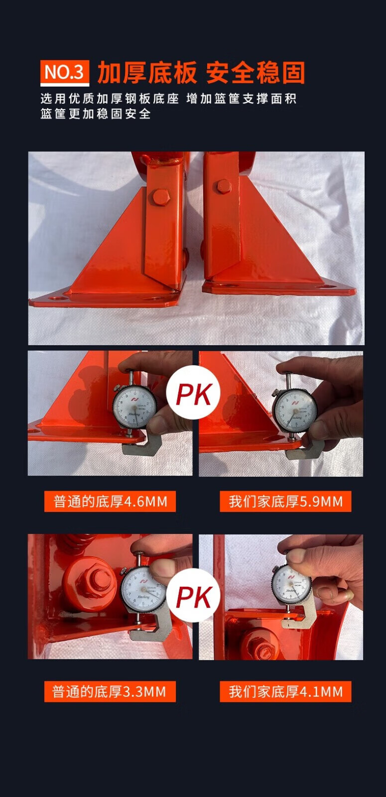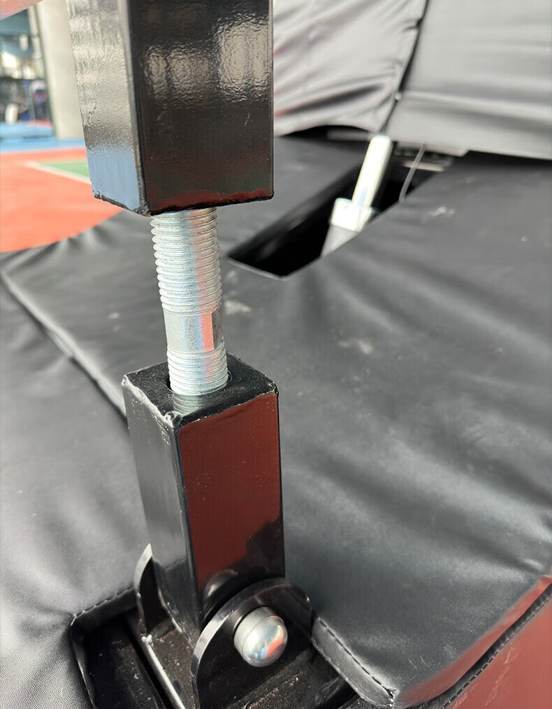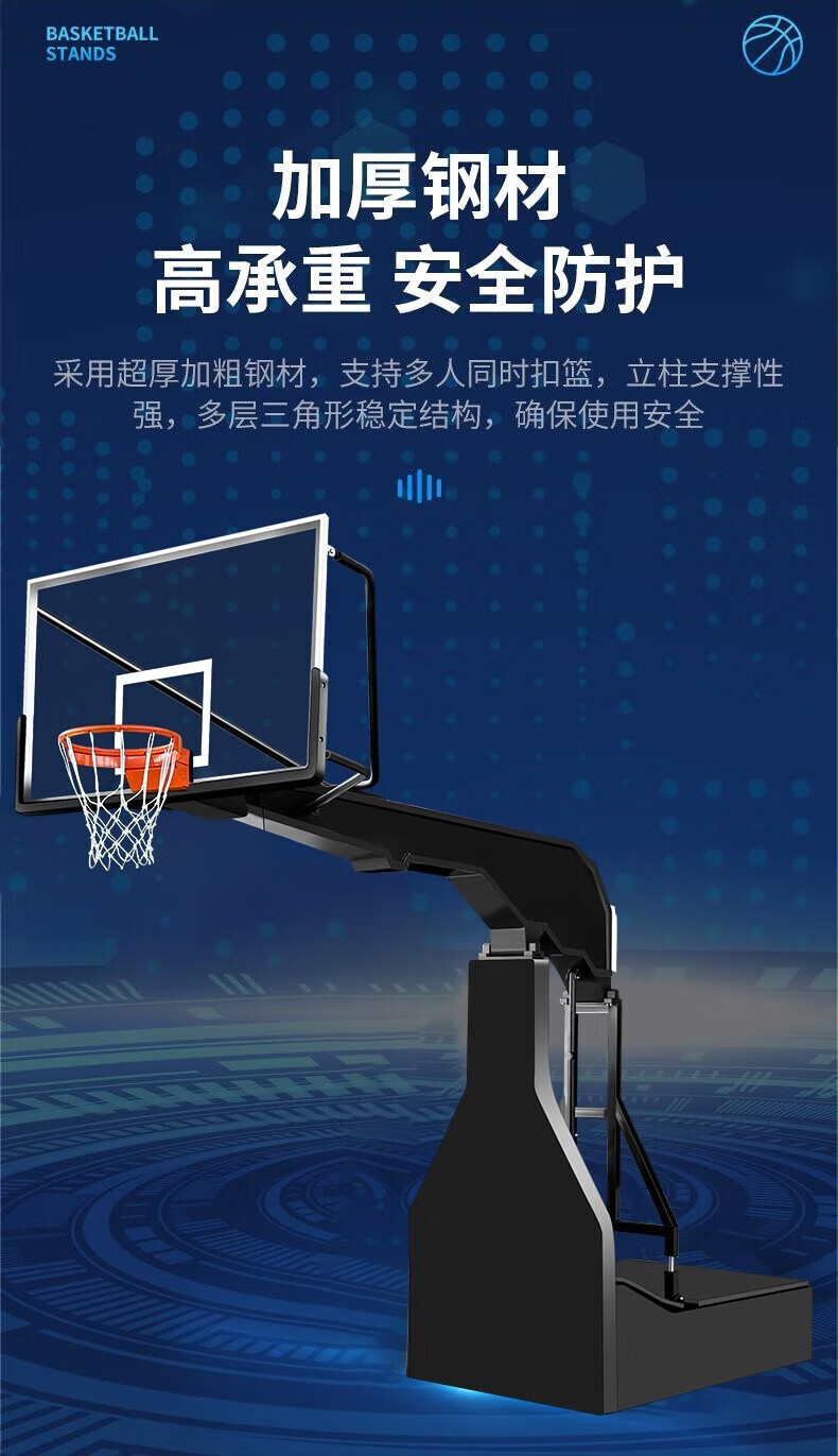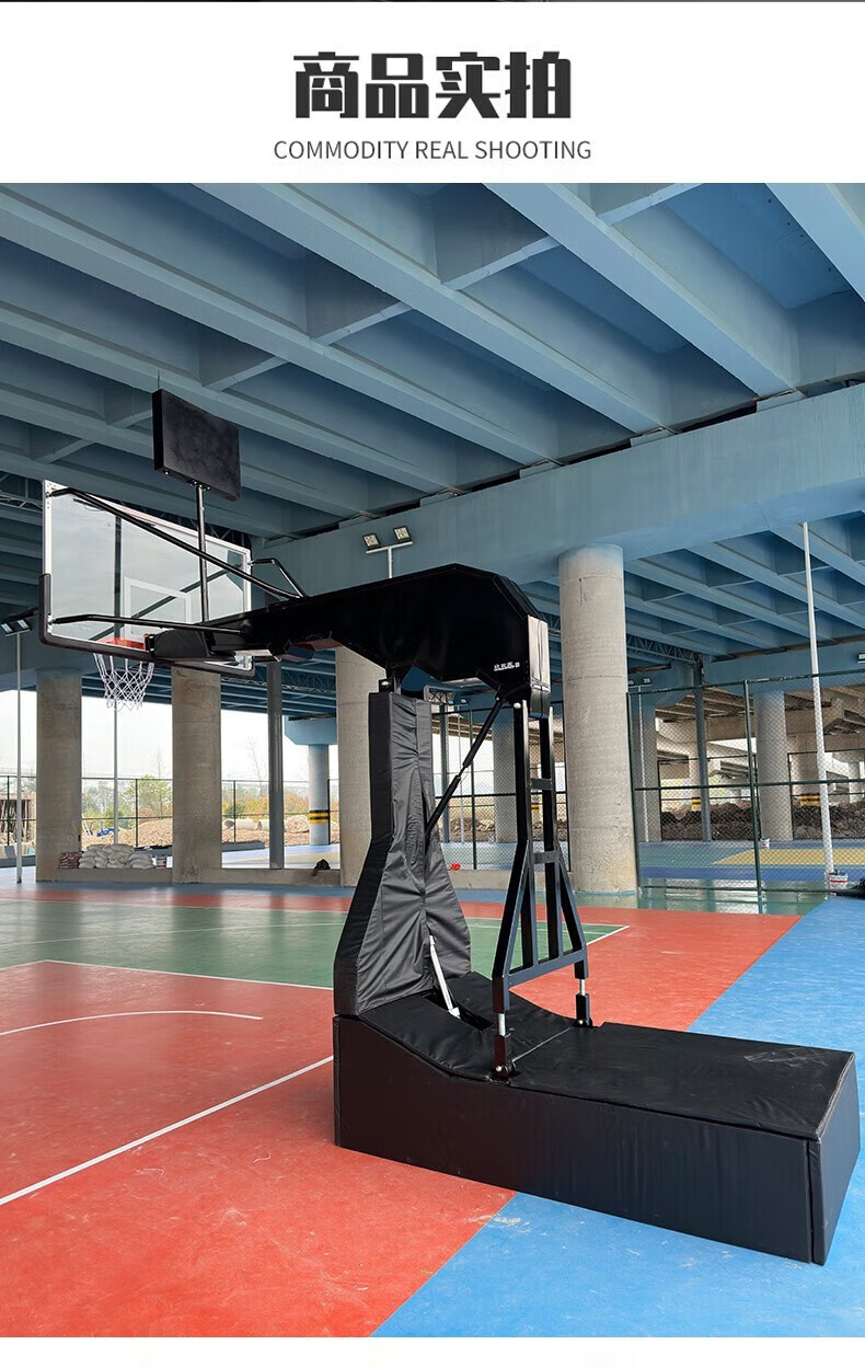 篮球架的移动底盒:优质钢板制成,尺寸为:20(高)*100(宽)*180(长),移动底盒里装负重物,以保证在使用时的稳定性,篮球架的主杆与篮板之间的拉杆:两根优质圆形钢管与主杆形成三个三角型,保证篮板的稳定